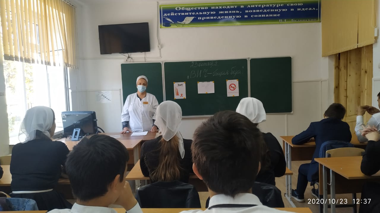 23.10.202023.10.2020г. в МБОУ "СОШ №1 с. Гойты" была проведена беседа на тему "ВИЧ - инфекция" мед. сестра Имурзаева П.Х. рассказала о ситуации по ВИЧ - инфекции на территории ЧР и мерах, направленных на своевременное выявление и лечение больных с ВИЧ - инфекцией.