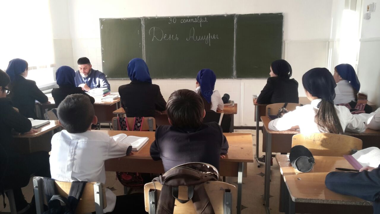 30.09.2017В целях духовно- нравственного воспитания обучающихся , а также приобщения их к почитанию священных дней , отмечающих как День Ашуры, в школе были проведены мероприятия : классные часы, беседы, был прочитан мовлид- священная молитва , которая обязательна и свята во всех мусульманских семьях.
